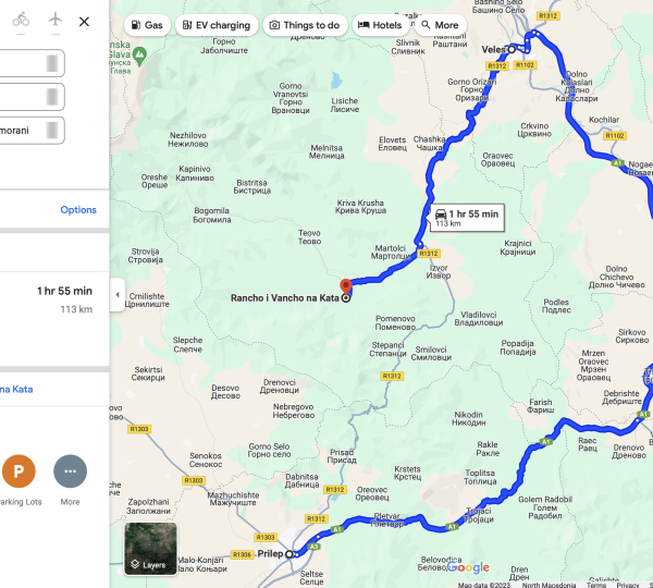 to drive via Veles city (distance 113km, traveling time 2h).