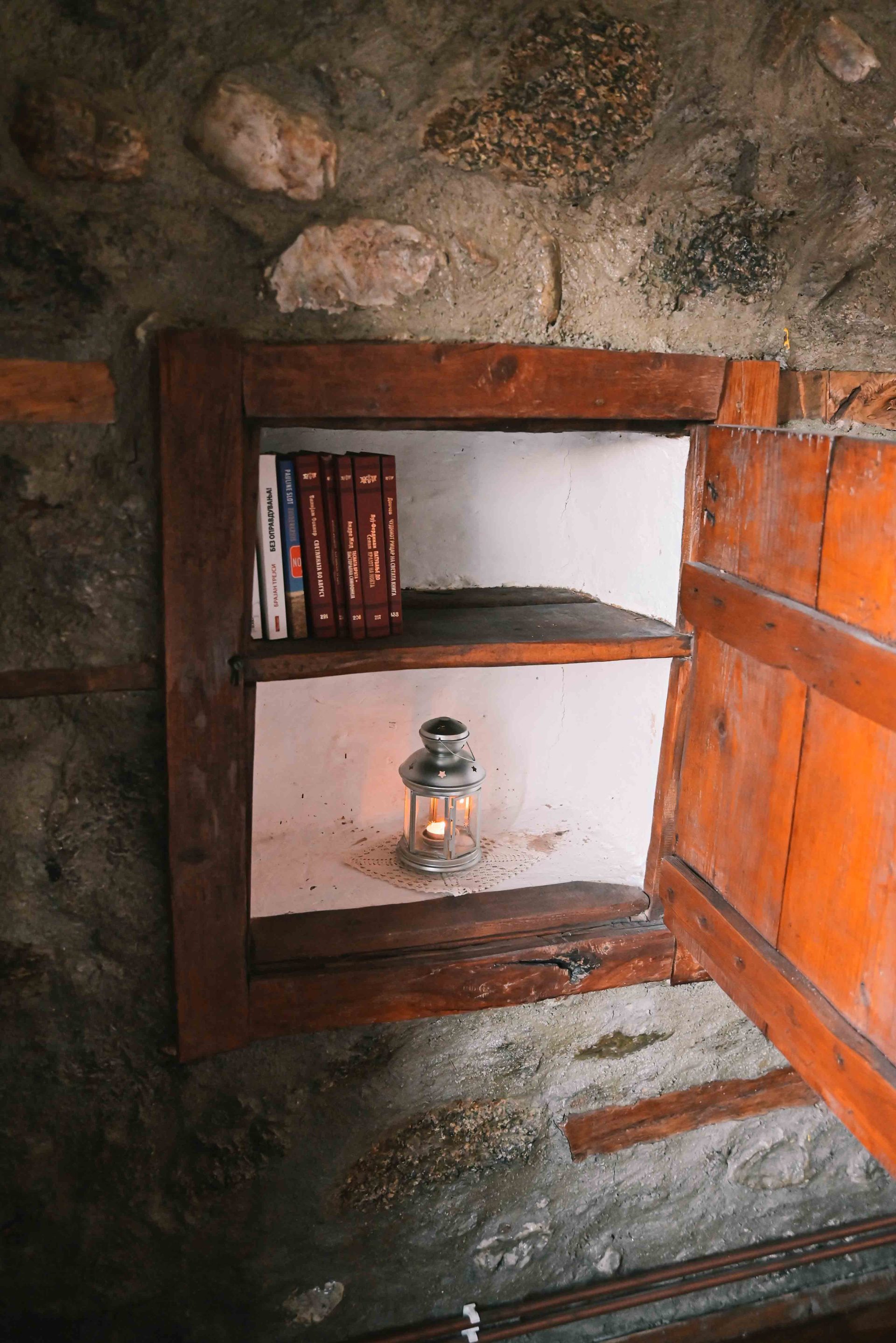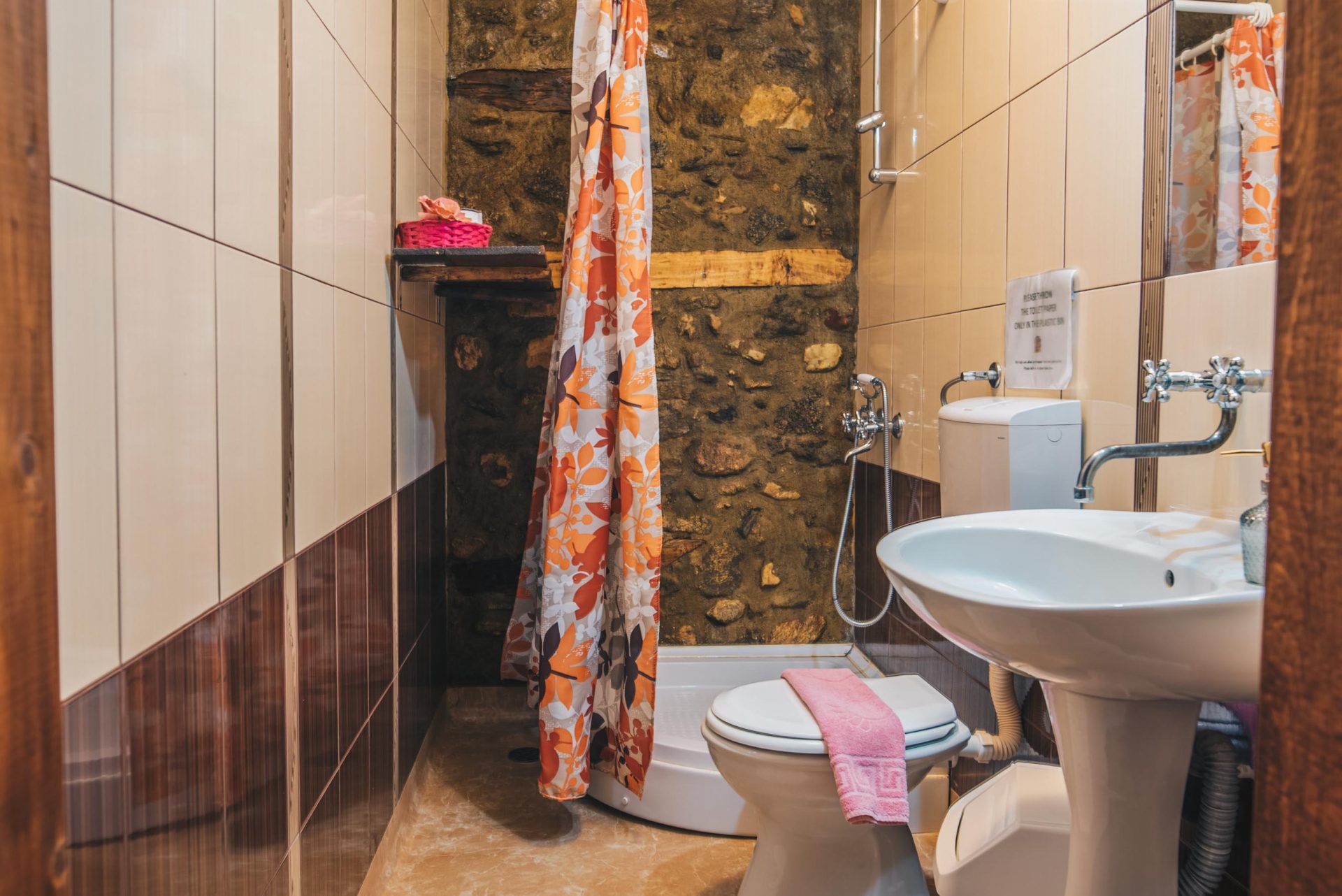 An alluring room, inspired by the Ottoman-style, original “dolap” (small closet) built in the stone wall, in which you can offer a coin to the Universe, followed by a prayer to make your wish come true. The room has a double bed (2m x 140cm x 20cm) from wood and iron, that is handmade by the owners themselves. A hand-embroidered Wiehler Gobelin “Concert” by Kata’s mother and an antique walnut tree chest of drawers from the Yugoslavian period add an extra warm sense when waking up in the morning. The bathroom is in burgundy-cream tonalities.